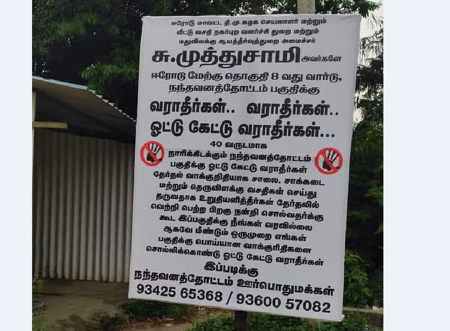 அடிப்படை வசதிகள் செய்துகொடுக்காத அமைச்சர் முத்துசாமி ஓட்டுகேட்டு வராதீர்கள் என்று ஈரோடு மாநகராட்சிக்குட்பட்ட நந்தவனத்தோட்டம் பகுதியில் வைக்கப்பட்டுள்ள பிளக்ஸ் அங்கு பரபரப்பை ஏற்படுத்தி உள்ளது.
