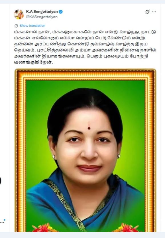 இந்த நிலையில், த.வெ.க உயர்மட்ட நிர்வாக குழு தலைமை ஒருங்கிணைப்பாளரும், கொங்கு மண்டல அமைப்பு செயலாளருமான செங்கோட்டையன், ஜெயலலிதா நினைவு நாளையொட்டி எக்ஸ் தள பக்கத்தில் பதிவிட்டுள்ளார். செங்கோட்டையன் தனது எக்ஸ் தள பக்கத்தில் வெளியிட்டுள்ள பதிவில், ‘‘மக்களால் நான், மக்களுக்காகவே நான் என்று வாழ்ந்து, நாட்டு மக்கள் எல்லோரும் எல்லா வளமும் பெற வேண்டும் என்று தன்னை அர்ப்பணித்துக் கொண்டு தவவாழ்வு வாழ்ந்த இதய தெய்வம், புரட்சித்தலைவி அம்மா அவர்களின் நினைவு நாளில் அவர்களின் தியாகங்களையும், பெரும் புகழையும் போற்றி வணங்குகிறேன்‘‘ என்று குறிப்பிட்டுள்ளார்.
