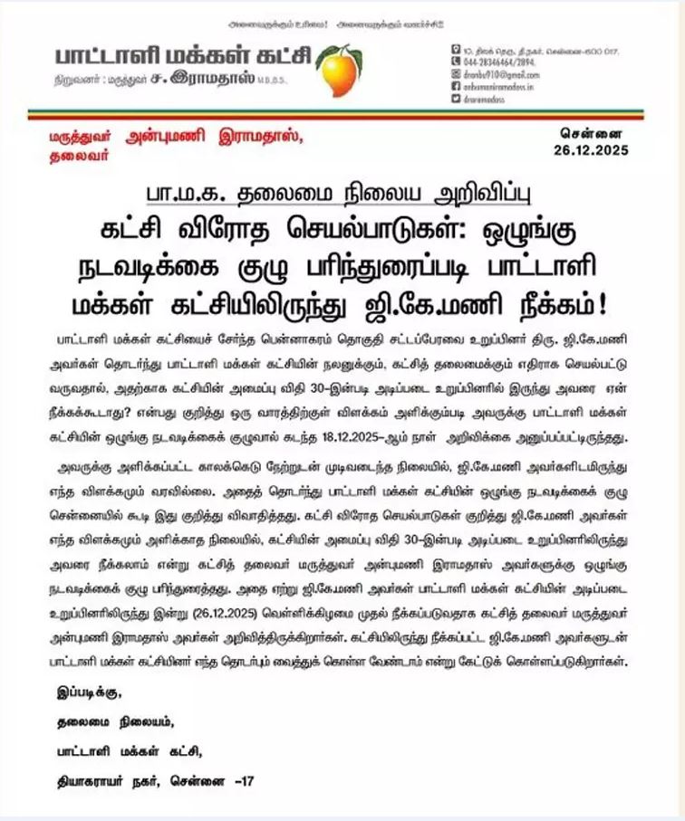 கட்சி விரோத செயல்பாடுகள், ஒழுங்கு நடவடிக்கை குழு பரிந்துரையின்படி பா.ம.க.வில் இருந்து ஜி.கே.மணி நீக்கப்பட்டுள்ளதாக தெரிவிக்கப்பட்டுள்ளது.