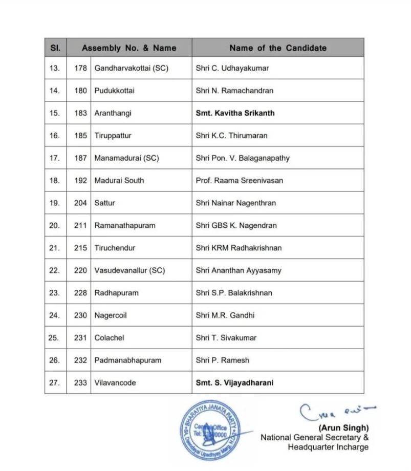 தமிழக சட்டமன்ற தேர்தலில் அதிமுக தலைமையிலான கூட்டணியில் 27 தொகுதிகள் பாஜகவிற்கு ஒதுக்கப்பட்டுள்ளது. இன்று (ஏப்ரல் 3) வேட்பாளர் பட்டியலை அக்கட்சியின் தலைமை அறிவித்துள்ளது.