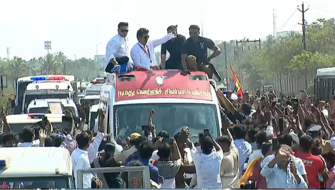 நடிகரும் தமிழக வெற்றிக் கழக தலைவருமான விஜய் இன்று (ஏப்ரல் 14) திருப்பூர் மாவட்டத்தில் அவிநாசி மற்றும் பெருமாநல்லூர் பகுதிகளில் தேர்தல் பிரச்சாரத்தில் ஈடுபட உள்ளார். முன்னதாக, தனி விமானம் மூலம் கோவை வந்த விஜய், சாலை மார்க்கமாக திருப்பூர் புறப்பட்டார். கோவை விமான நிலையத்துக்கு வந்த விஜய்க்கு ஏராளமான மக்கள் திரண்டு வரவேற்பு அளித்தனர். இதைத் தொடர்ந்து, விஜயின் வாகனம் கணியூர் சுங்கச் சாவடி அருகே வந்தபோது, அப்பகுதியில் ஆயிரக்கணக்கான பொதுமக்களும் தொண்டர்களும் திரண்டு விஜய்க்கு உற்சாக வரவேற்பு அளித்தனர்.
